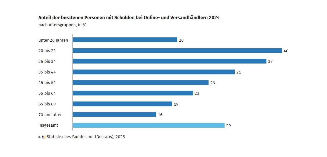 Im Jahr 2024 suchten in Deutschland gemäß Destatis etwa 577 400 Personen eine Schuldnerberatungsstelle auf. Knapp drei von zehn Ratsuchern (29 %) hatten offene Rechnungen bei Online- und Versandhändlern, ein Anstieg um zwei Prozentpunkte gegenüber 2019. Die durchschnittliche Online-Verschuldung belief sich auf 644 Euro, was lediglich zwei Prozent der durchschnittlichen Gesamtverschuldung von 32 976 Euro entsprach. Dies unterstreicht, dass digitale Einkaufskredite einen vergleichsweise geringen Anteil an der Gesamtfinanzlast haben.
